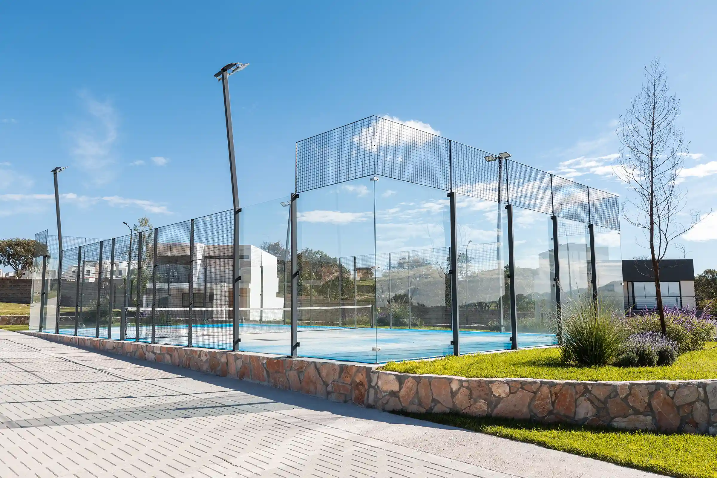 Casa club abierta, cancha de pádel, cancha de pickleball y áreas verdes.
